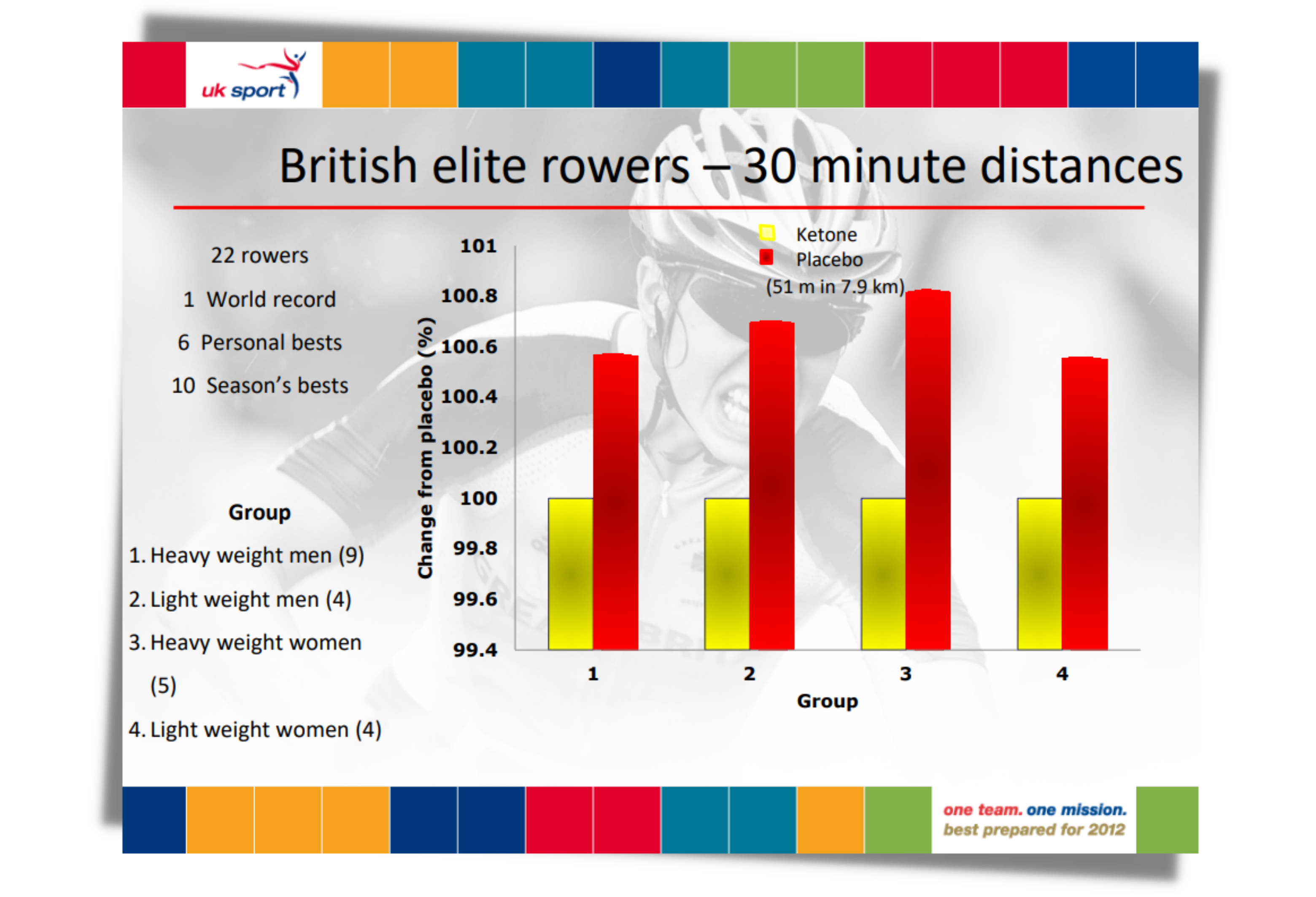 In one UK Sport presentation, Dr. Scott Drawer, then UK Sport’s Head of Innovation, who moved to Team Sky in 2016, presented the results of 30-minute trials in which British rowers had their performance assessed with, and without ketones. Of the twenty-two rowers who took part, one set a world record, six set personal bests and ten set season’s best while taking ketones.